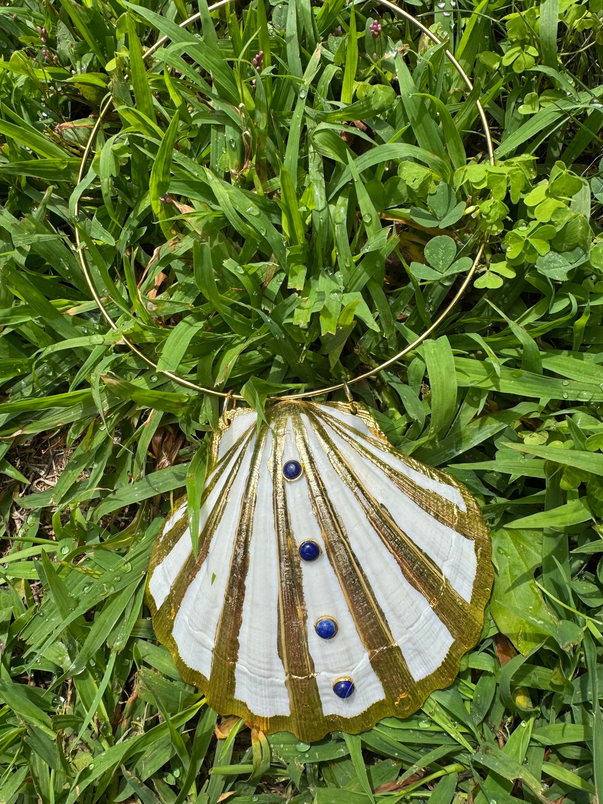Large Shell Necklace with blue lapis stones on 14K gold-filled wire
